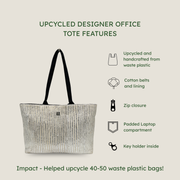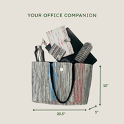 Product Description - Meet the Upcycled Handcrafted Designer Office Tote 16", the stylish work companion made to carry it all. Functional, spacious, and durable, it comfortably holds your laptop, charger, phone, notebook, pens, water bottle, and tiffin.