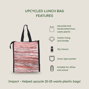 Coping with a demanding routine is challenging for school, college kids and office-going individuals, especially today! To keep yourself thoroughly nourished and energised throughout the day, use our UPCYCLED-HANDCRAFTED eko Lunch Bag. It's spacious, with well-stitched handles that make for a comfortable grip. It can easily hold a 1-litre bottle and lunch boxes, making it the perfect lunch bag for work, travel, school, storage, etc.
