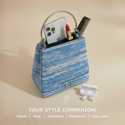Product Details - Made from EcoKaari’s upcycled, handcrafted fabric using waste plastic on the outside, with cotton canvas lining inside. Features include a small open pocket and a metal handle for a sleek finish.