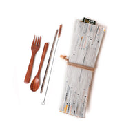 The kit includes a wooden spoon, fork, steel straw, and a straw cleaner.
