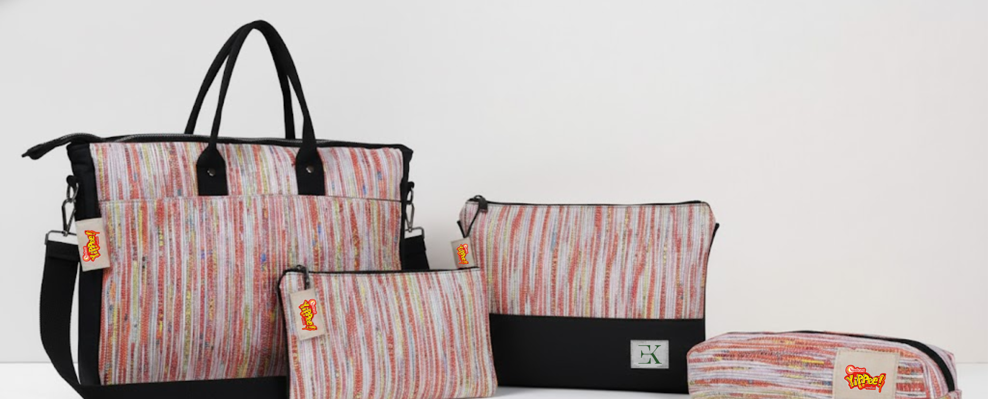 Our ongoing project is with ITC’s Terra by YiPPee! Project. Under EcoKaari X Terra by YiPPee! We are upcycling YiPPee! Noodles wrappers made with Charkha and Handloom, transforming the fabrics into beautiful, super-useful Upcycled-Handwoven accessories!